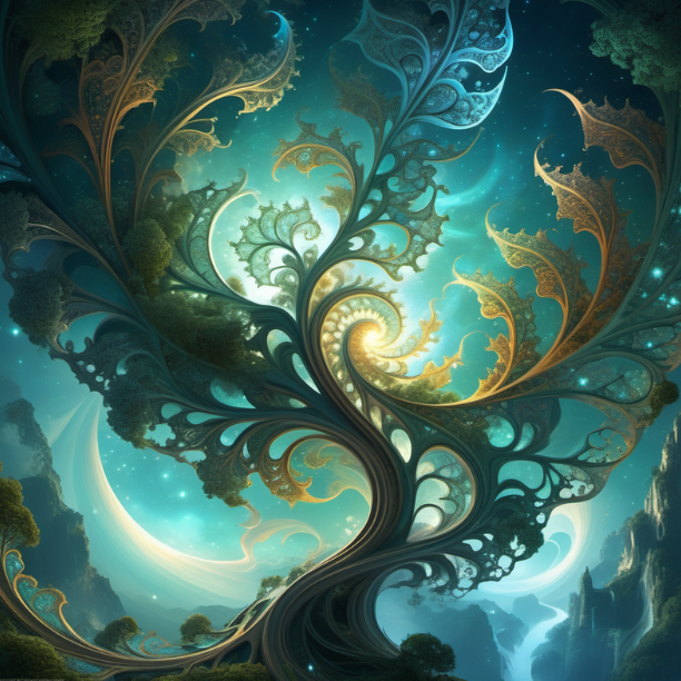 This artwork demonstrates the AI's capability to create intricate fractal patterns, fused with elements of nature and technology, resulting in a harmonious blend of organic and digital aesthetics.